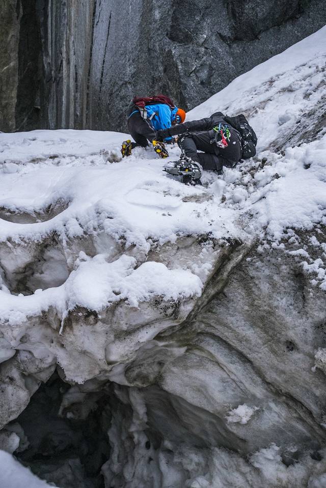 后面这段路远看不怎么难,实际却是脚下都是硬冰加上一层薄薄的雪,根本踩不稳,随时都要滑坠的可能,四周遍布着很多深不见底的冰裂缝。