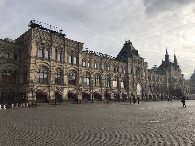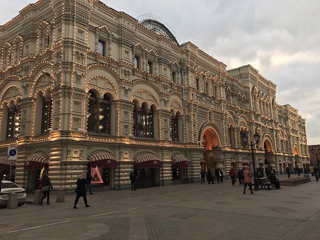 古姆百货就在克里姆林宫对面,很大,里面的冰淇淋很好吃,进去的时候吃的巧克力味的,出来吃的奶油的50卢布一个,还不错,三楼有一个木木快餐店,想体验俄餐的可以先试一下