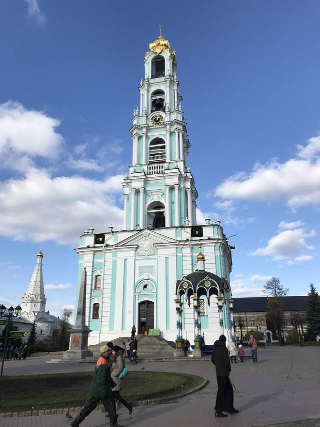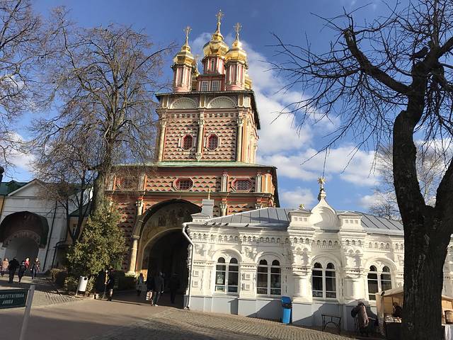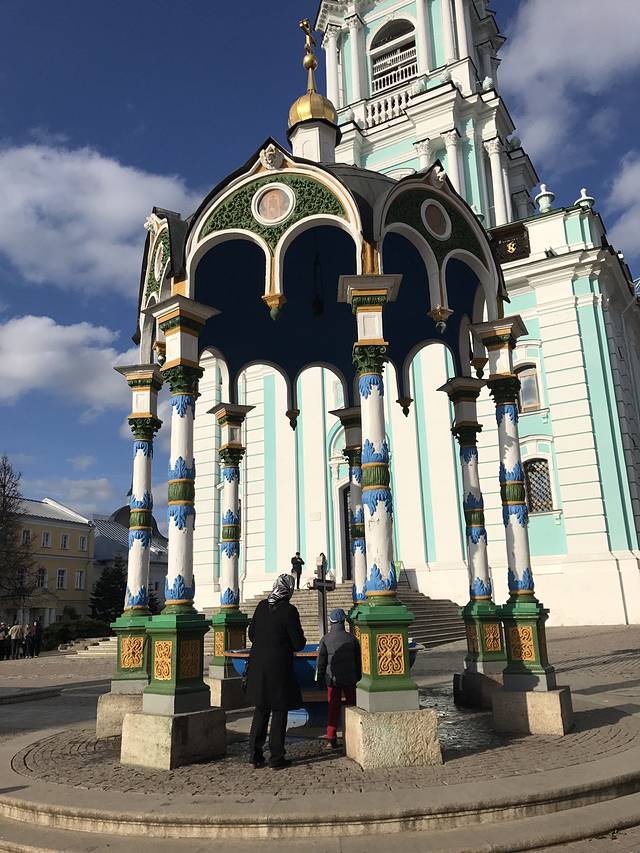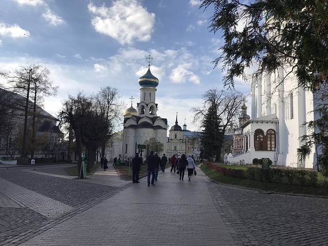 第四天:一天只去了一个地方,金环小镇,谢尔盖耶夫圣地。因为金环小镇离市区比较远。先乘坐橘色地铁6号线在全俄展览中心下车,然后再穿越马路,在马路对面有一个小汽车站,可以乘坐388号大巴车前往,票价200卢布。到达以后穿越小镇。就能远望到圣地。售票口在教堂外的一个房子里,在一楼,带单反的同学需要购买摄影票,100卢布,门票350卢布,会送你一个冰箱贴,以供纪念。里面有很多鸽子,可以买点面包喂鸽子啦,它还会跳到你的手上。里面有一个圣水池,很多当地人都选择拿着瓶子,桶带回家,我也就是看看,还是算了,没喝。回来我选择坐城际火车回去,票价170卢布,直接购票就可以,翻译软件告诉售票大妈你到莫斯科就可以了