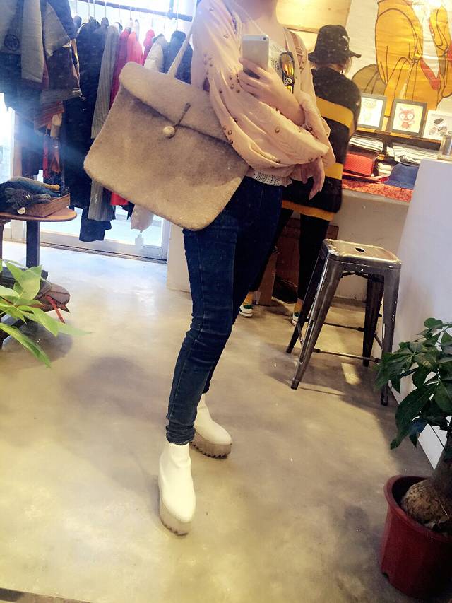 1.人民路,我觉得很好逛,里面有很多比较有特色的小店,还有几家设计师品牌店,可以淘到一些比较有设计感的东西,比如我就看中了下面图中的包包,在我们这边是找不到的,它是羊毛尼制作而成的,是一个设计师设计的款,放在店里卖,里面还有一些首饰,衣服,围巾都很有特色……