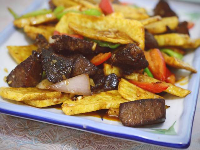 在莫家街某家饭馆吃的牛肉,味道很好。莫家街其实很短,但当地人一般都不会在那里吃,但在马忠食府里面汇集了当地很多美食,时间有限的游客们还是值得一去的,我们还在马忠食府吃了羊肠粉,样子有稍微那么一点的粗犷~~啊哈哈哈就不照相了。