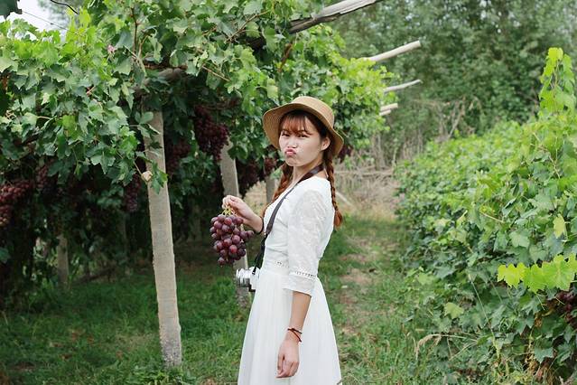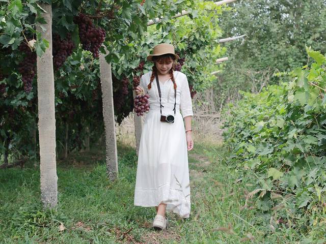那里的葡萄呀,真的是又大又圆又熟又甜,我进去用两个相机随便拍了几张,然后我们就蹲在那里先吃饱了再说,哈哈哈哈。但是中午的时候我们吃饭吃得太饱了,只吃了一点葡萄就胀得要命,早知道今天中午就不吃午饭了,真是悔不当初啊