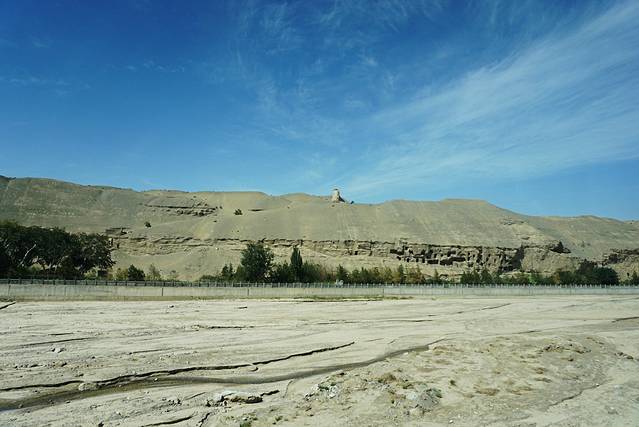 →坐景区大巴车进入莫高窟主景区(车程15分钟)→ 下车集合,等待配备导游(导游带队,一队大概20人,也可以自己逛),然后再往前走大概1千米左右就到莫高窟前了。