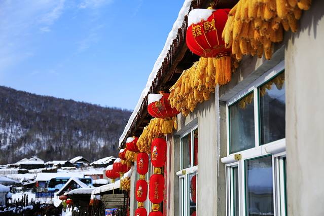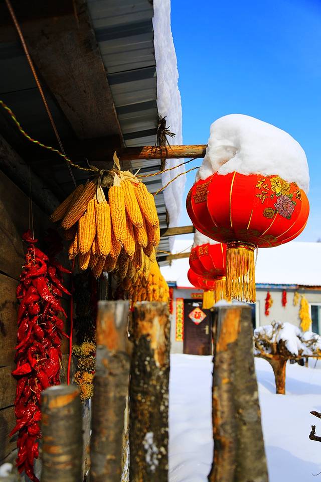 大红灯笼高高挂,墙上、房檐下晾着玉米、红辣椒、松塔、干蘑等,到处都洋溢着丰收与喜庆。