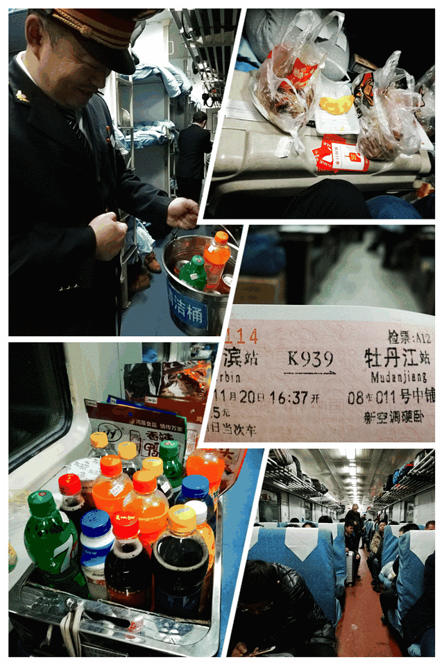 好久没坐长途火车了,每次出门不是自己开车就是飞机,坐火车一般也都是高铁或动车,三个小时以上的火车经历基本上没有,都快忘记学生时代买不到坐票熬夜站一宿的滋味了。所以这次决定坐火车去威虎山雪村时一直抑制不住心里的小兴奋,哈尔滨到牡丹江大概需要5个小时,晚餐也要在车上解决,于是买了一大顿辣货作为晚餐,姐可是无辣不欢的主儿,当然还不能忘记带水杯,火车上免费供应的热水一定要好好利用。火车摇摇晃晃的开始了旅程,偶尔会有“啤酒饮料矿泉水,瓜子花生方便面”的叫卖声,或者“腿收一下,胳膊让一让”,此次出行终于接了把地气。即使坐的是卧铺,一群朋友也无心休息,吃着辣货,泡着碗面,促膝长谈,仿佛回到了年少时。