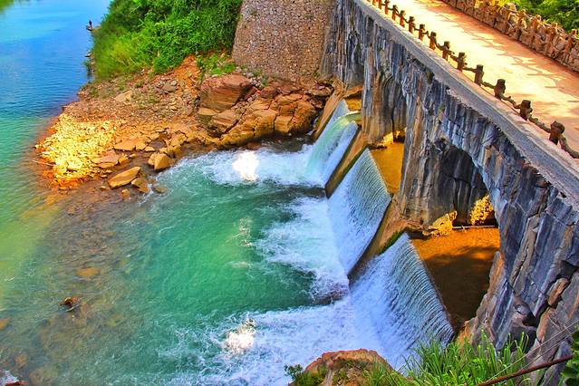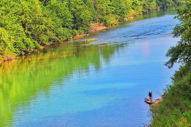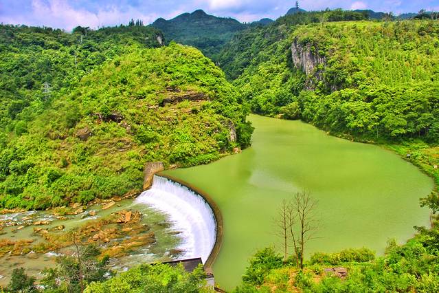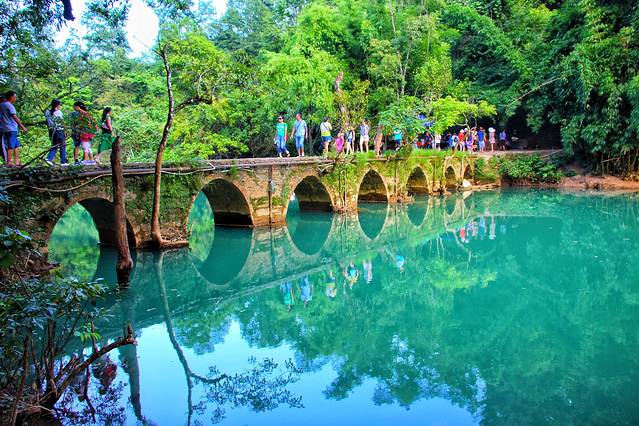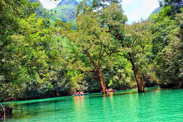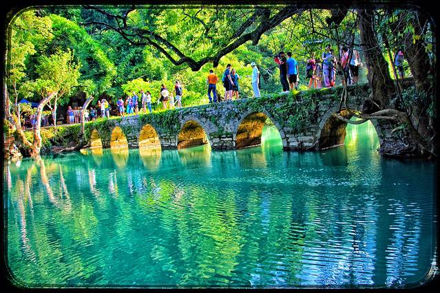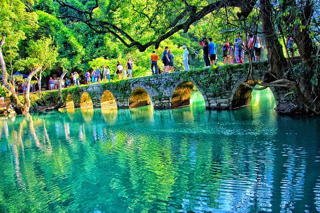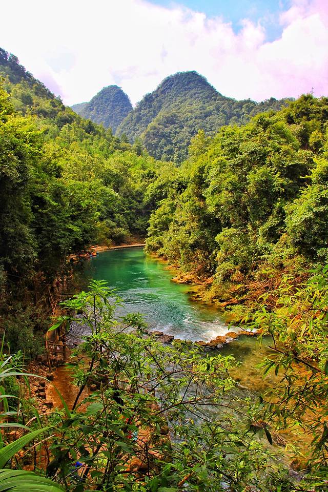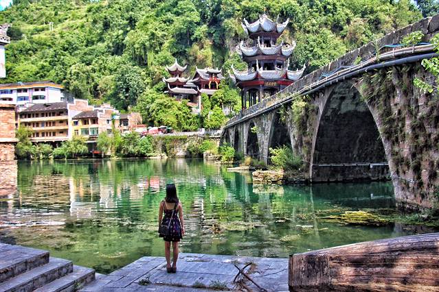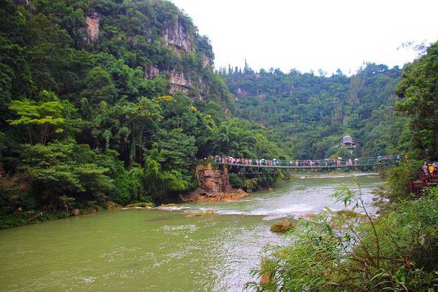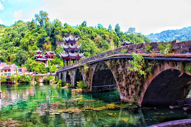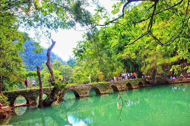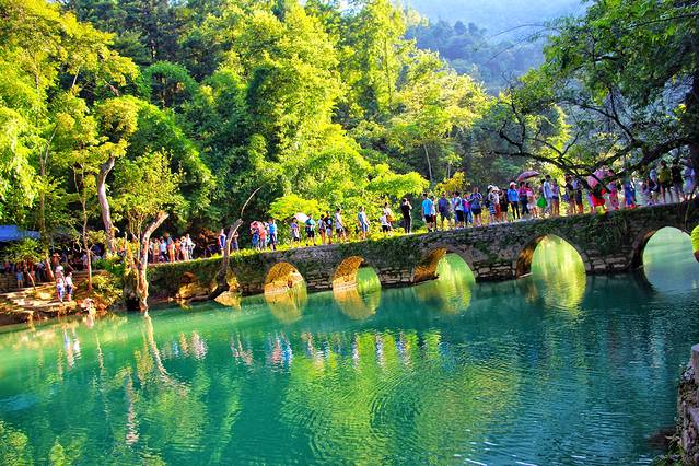 到最后一站景区之首的小七孔古桥,人也是多到爆棚想要拍张无人的小七孔桥那是不可能,小七孔桥以前是联通贵州和广西的必经之路。第一眼看到小七孔桥并没有心中所期盼的那么美,湖面上飘着很多白色泡沫状的泡泡看起来脏乱不堪,不过拍出来的小七孔桥却挺美的。