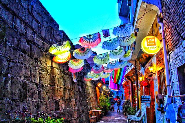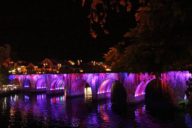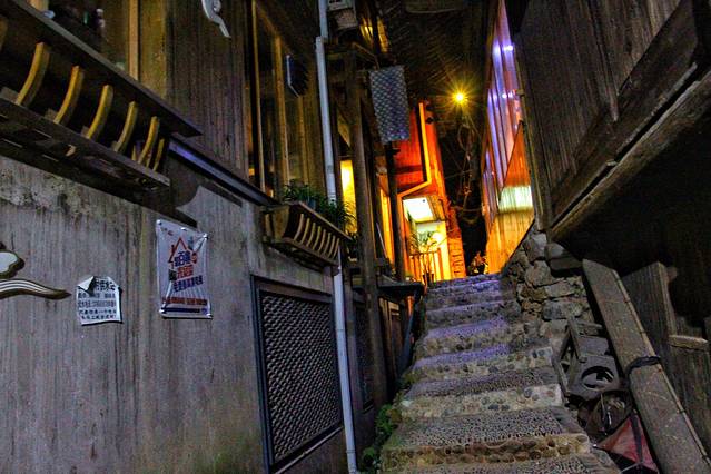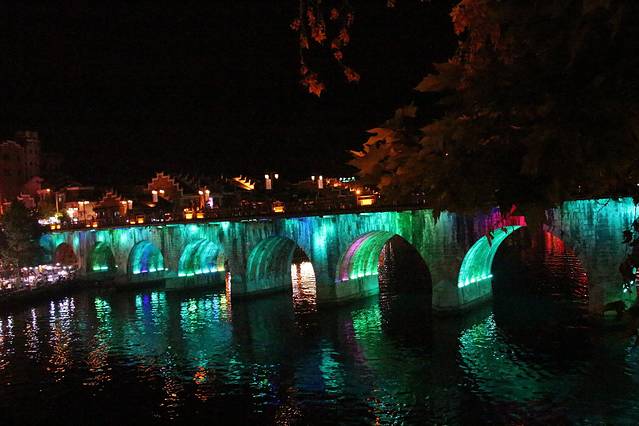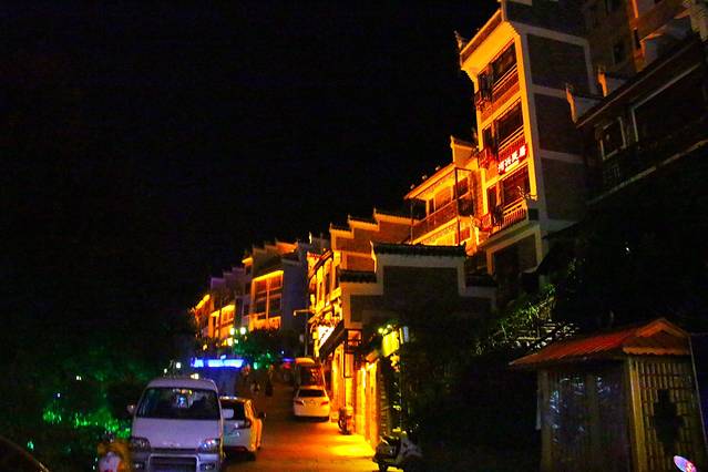 青龙洞出来就回客栈休息了,太阳实在太晒加上踩了一天的脚踏车实在太累。直到夜色降临才出门觅食,想趁天还没黑去城门洞看看,再去拍几张舞阳河的照片。