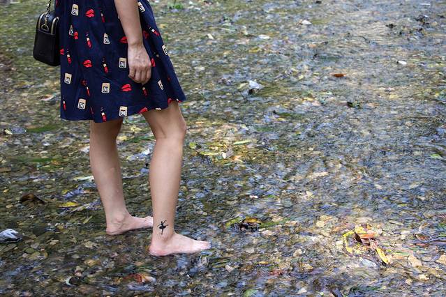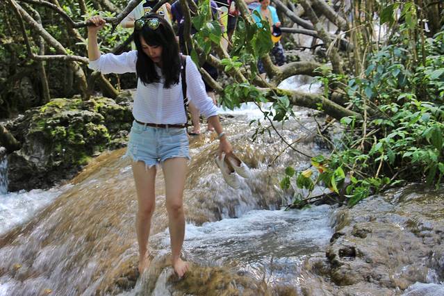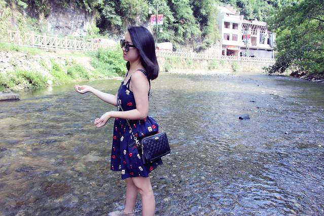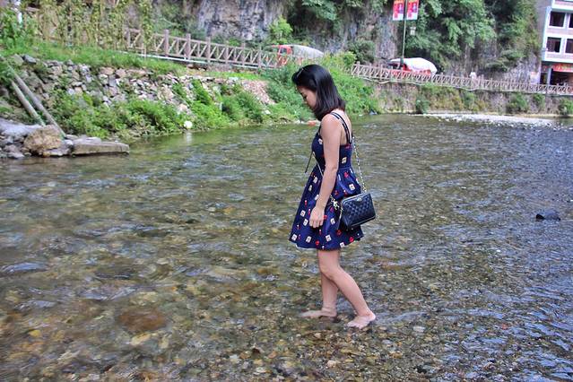 看到别人玩那么开心,心里痒痒的实在忍不住了,不管三七二十一我也下水了,走了一小段就上岸了,水流太急加上一路都是小丫同学小心翼翼的扶着走的,生怕脚一滑人和相机一起来个鸳鸯浴就得不偿失了,开始在岸上走都滑了几次。