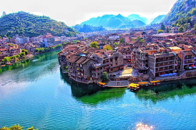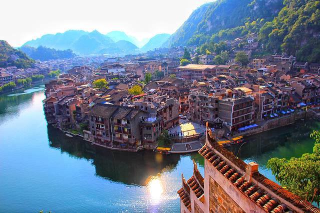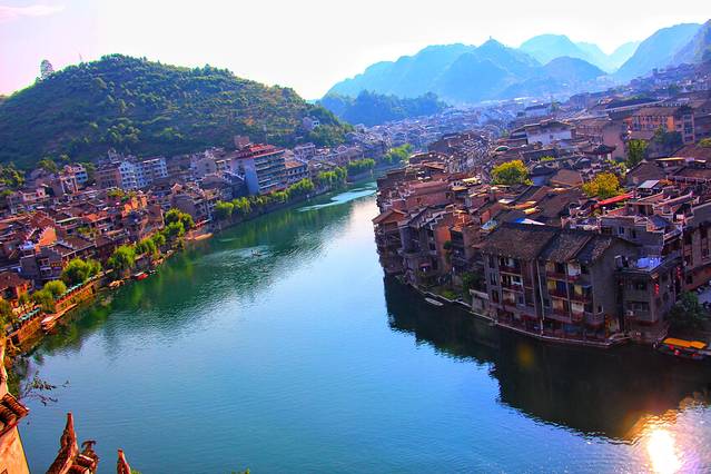 镇远自汉高祖五年(公元前202年)设县开始,已经有2200多年历史,是云贵高原上历史最悠久的名城。位于舞阳河,四周皆山,河水蜿蜒,以S形穿城而过,北岸为旧府城,南岸为旧卫城,远观颇似太极图。