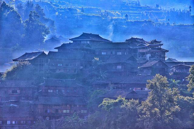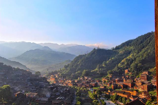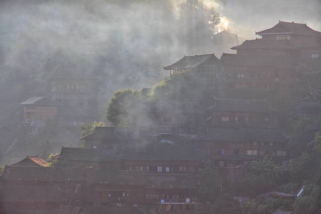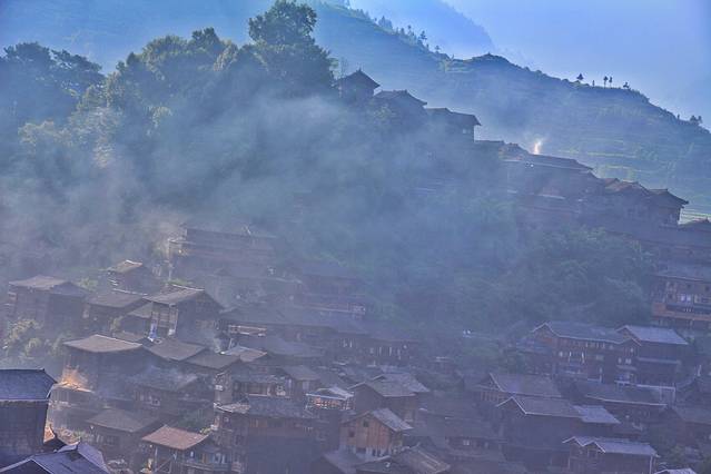 睡眼朦胧看到窗外已经天亮了,看时间才6点多,努力爬起来在房间透过窗户拍了几张,清晨的千户苗寨雾霭朦胧,炊烟袅袅,梦幻迷离的感觉。拍完照随即又蒙头继续睡了过去。