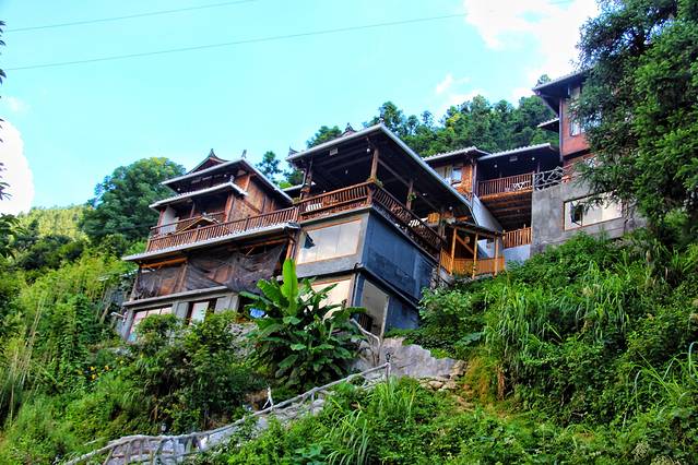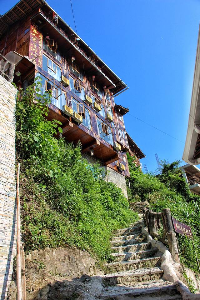 没有提前预订房间,因为想找间观景位置好的客栈,网上无法看到地理位置,想着自己直接来找会更靠谱,到了就犯傻了路边的太吵不想住,高处的又还得爬上去才能看到房型,小丫同学负责看守行礼,我负责爬坡找房间,看了几家房间都好贵,环境一般般收费都是三四百,这时肚子已经经不住折腾开始闹腾,在5号风雨桥旁边餐厅简单解决了中饭,从网上找了间距离比较近的客栈,离观景台距离仅2分钟路程,心想离观景台距离这么近客栈观景位置自然应该不会差,那就开始爬坡上山吧。