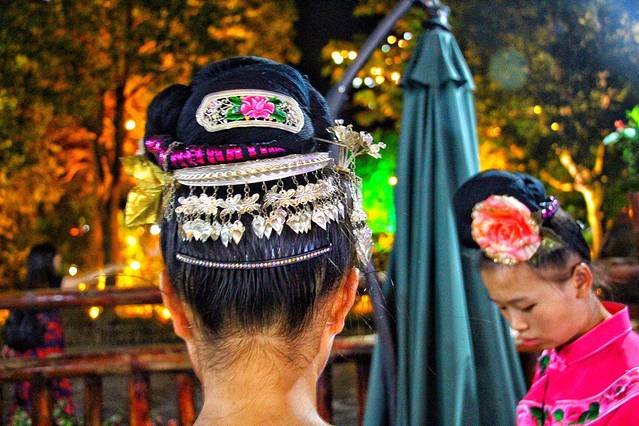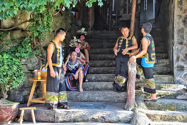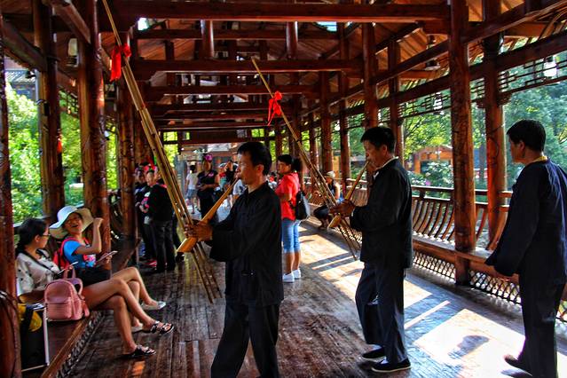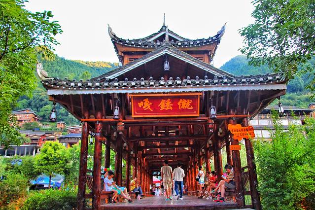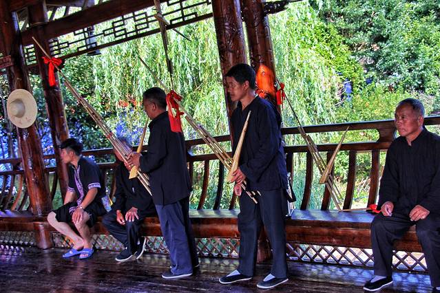 匆匆忙忙赶到了2号风雨桥看苗家飞歌,表演时间09:00-10:00幸好及时赶上了,但看到当时的情形完全不是我想象中那样,熙熙攘攘的几个人在唱,其它的全坐在旁边聊天,完全是应付式的表演,自然也没什么人观看。