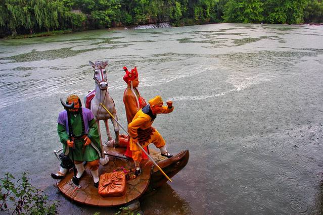 下雨天衬托得师徒四人和西游记戏中的画风还挺像