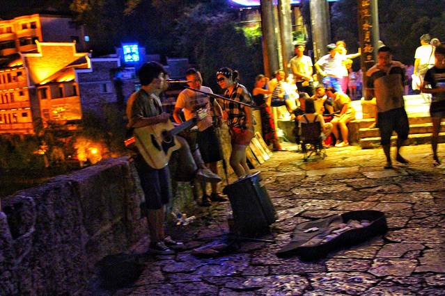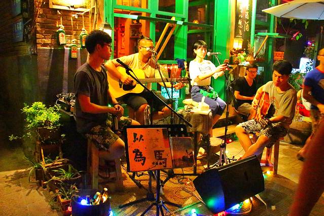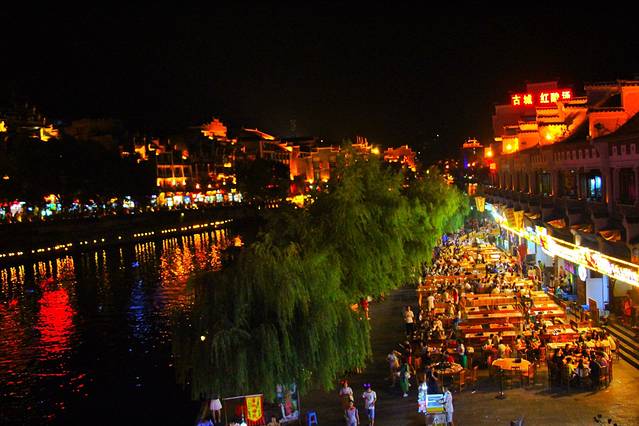 我们迎着舞阳河跃过无数家店,就是想找家靠着酒吧旁边的店铺,这样可以边吃饭边听歌多享受啊,舞阳河是饭店和酒吧集于一体的一条街,酒吧驻唱歌手都是坐在酒吧外面唱歌的,这样可以吸引更多的顾客。