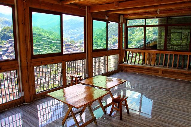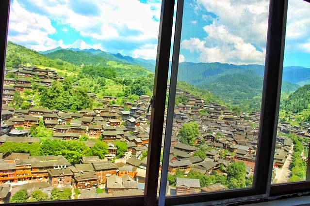 这家望西江客栈应该是苗寨观景位置比较好的,在半山腰每个房间好像都可以观景。