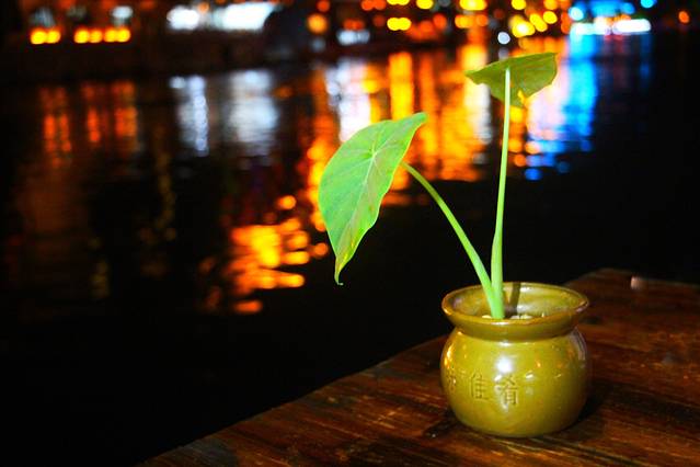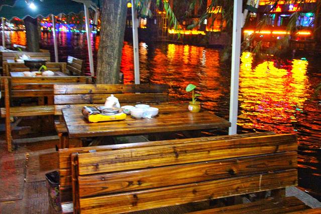 要环境好还要挨着酒吧,这样的店铺很难找到,只能折中选择环境,坐在舞阳河边上吃着火锅,迎着凉风,是一件多么惬意的事。灯光倒映水面,似点点星光点燃了微波粼粼的河面,河水也因此增添了暖色。