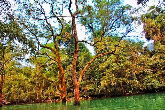 鸳鸯湖的由来是因为这2棵树,一雌一雄它们相伴数年,人们觉得它们很像一对鸳鸯,故名鸳鸯湖。湖面环境幽雅恬静,在迷宫一样的湖面森林里穿行加上特殊的蓝色湖水使得有些神秘气氛,来到这里有如到了仙境一般,湖里的岔路很多,有些地方仅能通过一条船的宽度,堵船撞船的事情常有发生。