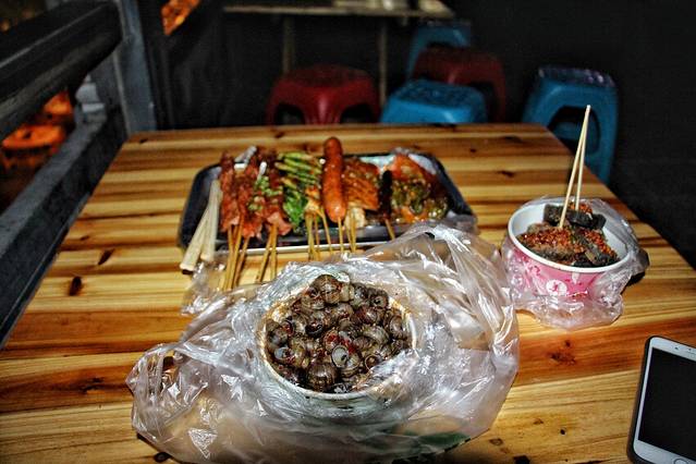 在青旅休息到天黑才出门,早已饿得饥肠辘辘,没有体力再去寻找美食,在就近的新大桥旁边小吃摊解决的,臭豆腐和田螺几乎没动太难吃了。