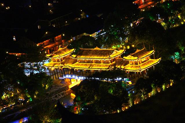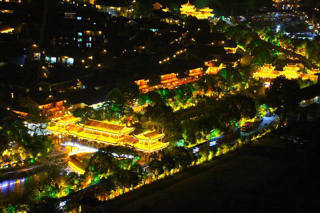 山下灯火璀璨,山坡上满山的星光很像萤火虫,夜晚亮灯也是苗寨的传统,苗家人上山劳作,常常忙碌到天黑。为了使村民行走方便,各家各户都在屋檐底下挂一盏油灯,给夜里回家的村民照路,形成了苗寨夜晚亮灯的传统。后来旅游公司统一改用了节能LED灯。