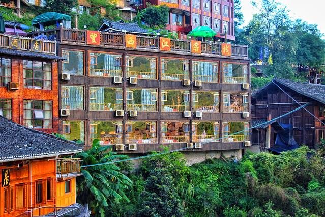 客栈观景果然不错,顶楼观景平台比景区观景台位置还好哦,刚进景区时不觉得这与西南其它古镇有什么特别之处,当在平台放眼望去,瞬间就惊呆了,密密麻麻的吊脚楼依山而建,非常状观,具有强烈的视觉冲击力。