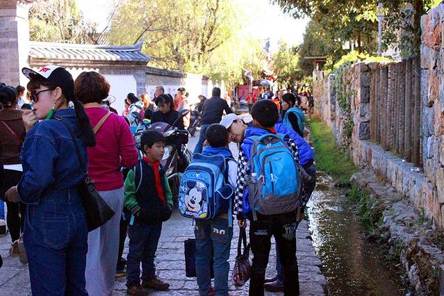 古城里的石桥和水边有很多这样穿着民族服饰的阿哥阿姐供大家合影啊拍照啊什么的