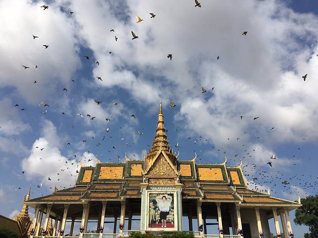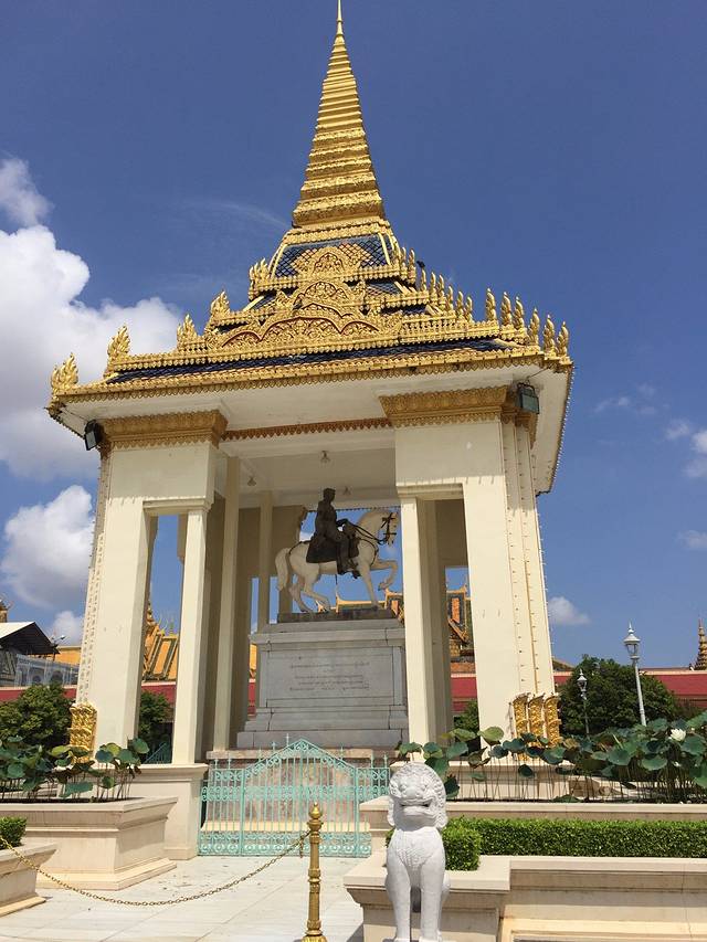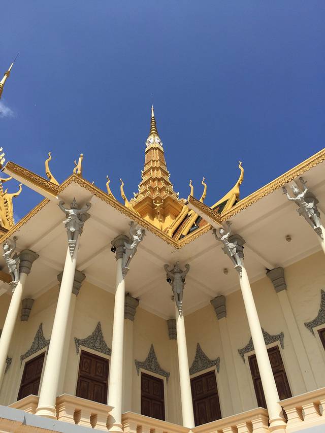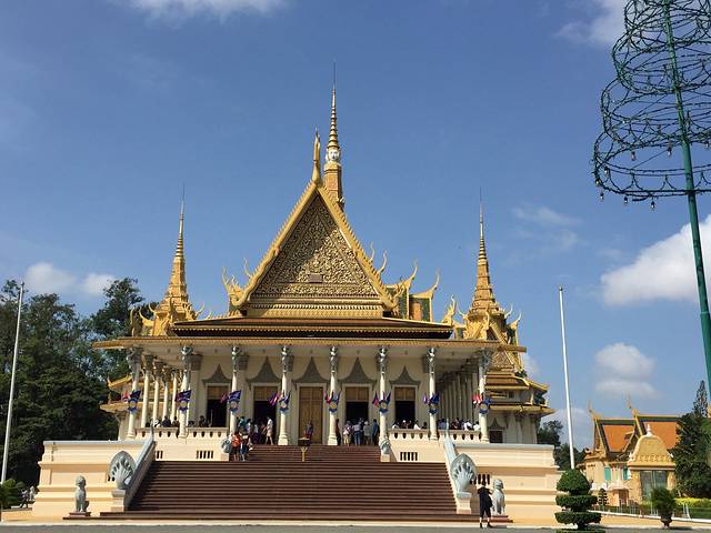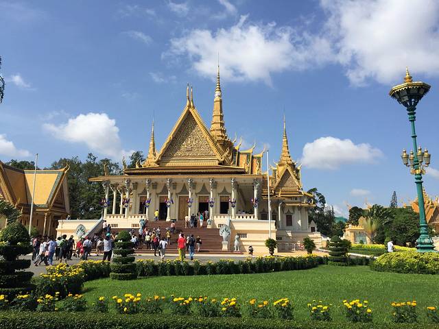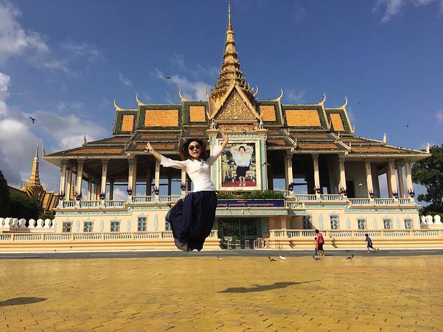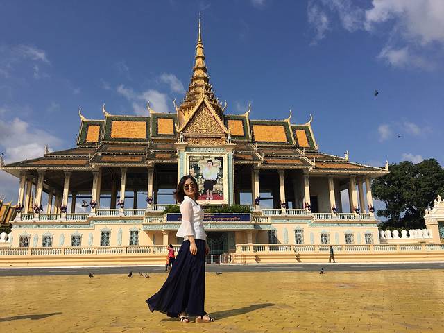 皇宫的门票是25000瑞尔,位于河边,跟曼谷皇宫非常相似。金边皇宫是西哈莫尼国王的正式寝宫,所以有部分是不对外开放的,游客只能参观到君王殿及其周围的建筑。需要特别注意的是,参观皇宫裙子/裤子不能短于膝盖,也不能穿背心噢。如果衣服不合格,皇宫门口有得购买。啦啦啦~刚到皇宫门口的大广场,我和我的小伙伴就开启了自拍和跳跃模式,噗...好多鸽子