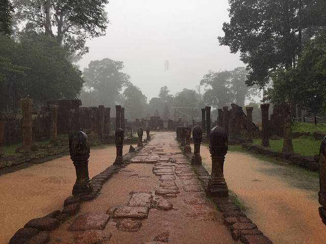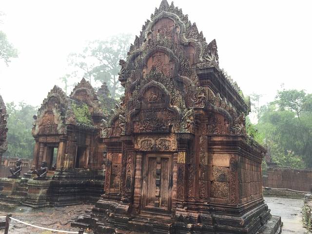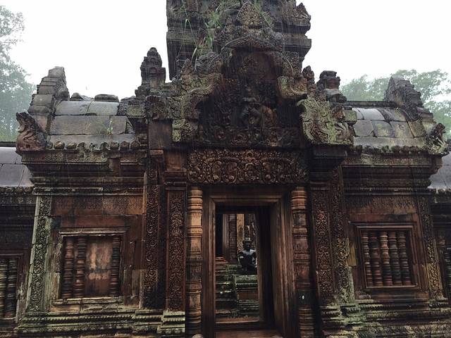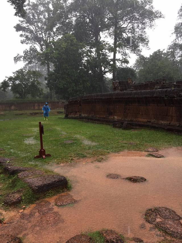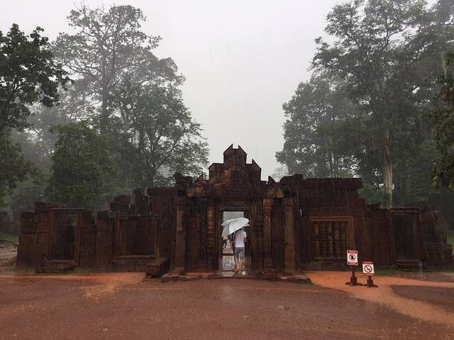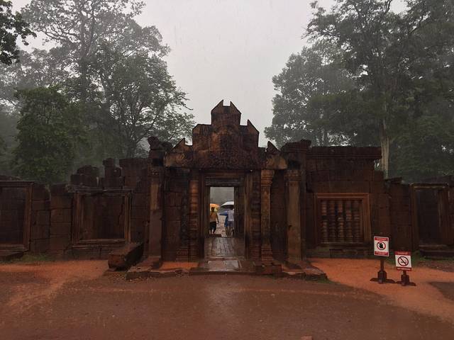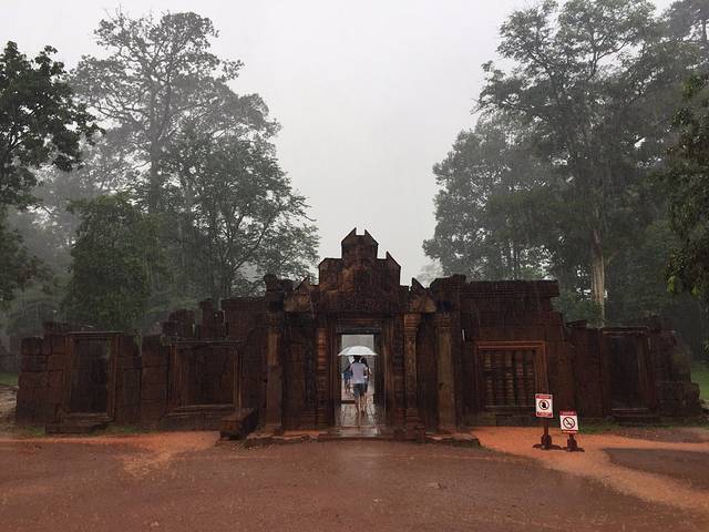 女王宫Banteay Srei:供奉湿婆神的印度教寺庙,由略带桃色的石块建造而成,有世界上最好的石雕作品。从高布斯滨往女王宫的路上,雨还是下个不停。等到抵达女王宫,偏偏不巧,也是雨水下得最大的时候。坐在车里,外面有当地的小孩子,都是大人要求的吧,拿着雨衣雨伞在外面叫卖,拼命地拍打我们的车窗。下这么大雨,小孩子们偏偏雨衣也没穿、雨伞也没撑。那么一刻,实在不忍,只好别过脸去,不敢看向窗外。其实,在吴哥窟各个寺庙,特别是外圈,包括在罗洛寺的时候,寺庙门口就会有很多小孩子,拿着水果(香蕉,下雨的时候是雨衣)对着前来的游客叫卖。看到是中国人,他们还会说上几句中国话,一小女孩朝着我们走来就大声地说道“姐姐!你好!我叫CiCi,你买我的香蕉吧。”他们好乖啊,我说我们出来的时候再买,她便目送我离开,还不忘说“姐姐!你待会记得找我哦,我是CiCi”。等我们参观之后,我喊“CiCi呢,买香蕉啦”。等到把手中的香蕉都卖出去之后,小女孩可高兴啦,又回去找大人拿香蕉。柬埔寨太穷啦,很多大人会指使小孩子去卖东西,甚至是乞讨。