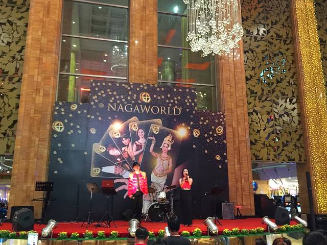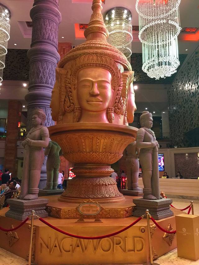 金界赌场,柬埔寨唯一合法、有执照的赌场——首都金边金界娱乐城Nagaworl。Naga也是来源于印度的一个神话人物,俗称多头蛇,揭路荼同父异母的兄弟和敌人。控制雨,并决定着帝国的繁荣,常见于引道、出入口和屋顶。出现在寺庙的七头那伽代表彩虹,是连接天堂和人间的桥梁。金界娱乐城里面豪华气派、金碧辉煌。走进里面,正中央舞台有乐队在演奏粤语歌曲,赌场里面大部分都是中国人。记得在报纸上看到,金界娱乐城Nagaworl上半年的营业额达到了几十个亿。