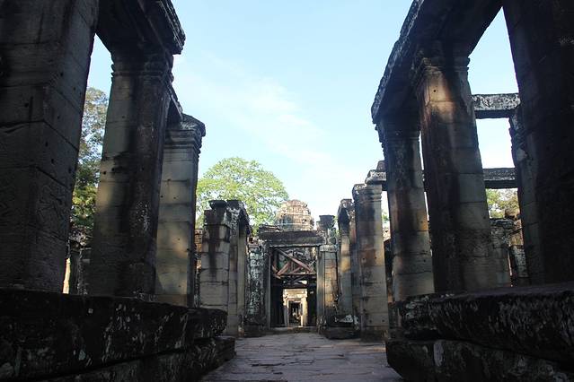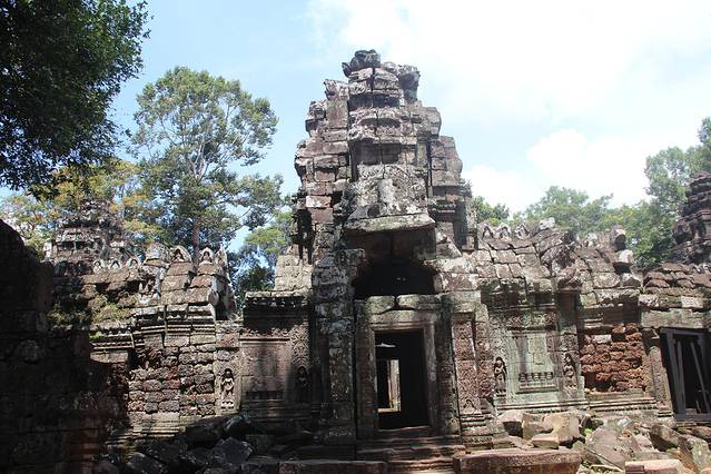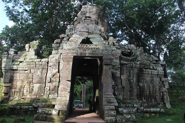 斑黛喀蒂 (Banteay Keay) ,中央寺塔及长廊都已坍塌。四门上都饰有神鸟伽鲁达浮雕,门上方也有四面佛雕像。