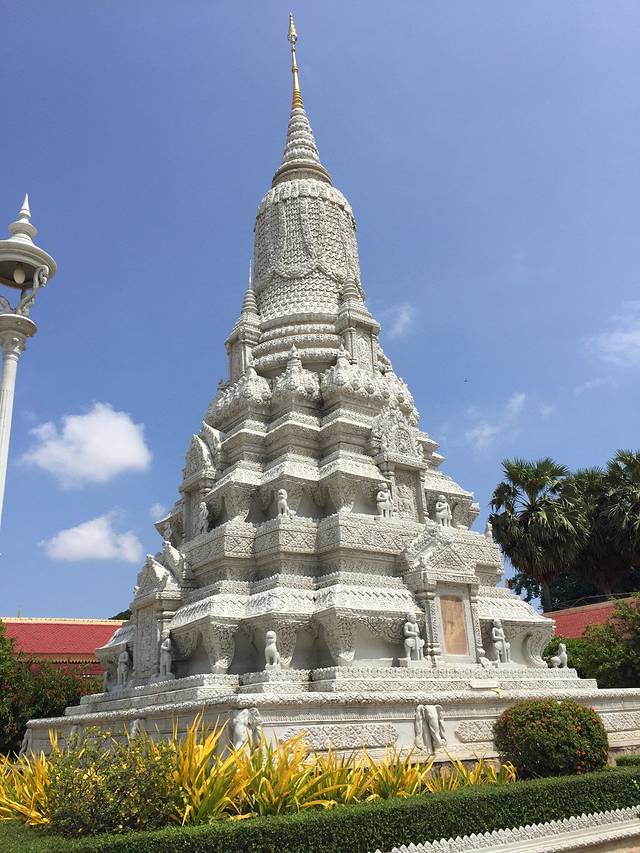 金边银塔,最早是由诺罗敦国王于1866年建造的,塔的大部分为木结构。1962年,由嘻哈努力克亲王组织扩建。盖塔高达59米,用重达6吨的五千余块银砖堆砌而成,是世界五大名塔之一,与“胡夫金字塔”“埃菲尔铁塔”“比萨斜塔”“仰光金塔”齐名。