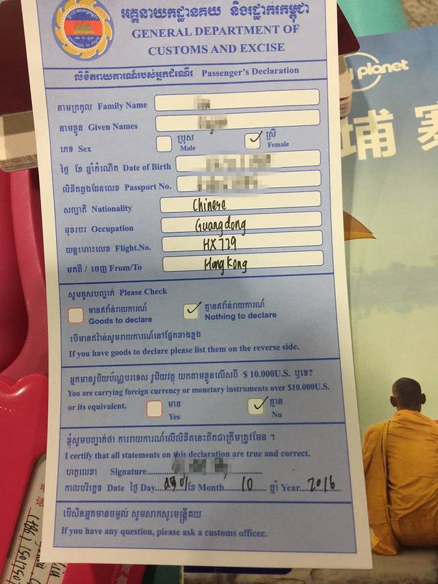 JOJO和Ensen 都是第一次出国,比原本预计的时间提前了一个小时抵达金边机场。下来机场后,就按照指示,一路上填写了入境卡和申报单。先前看攻略就说落地签或者过境的时候,会有边检人员索要小费,到达金边机场我们是没有遇到,不过从柬埔寨回广州的时候,Ensen说他那个工作人员有小声地一直念“小费啊”,不过直接忽略不理他也就过关啦。