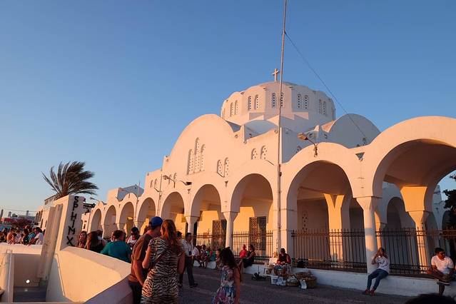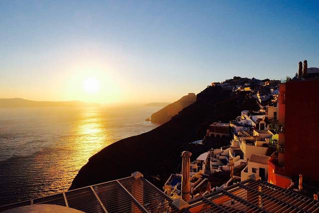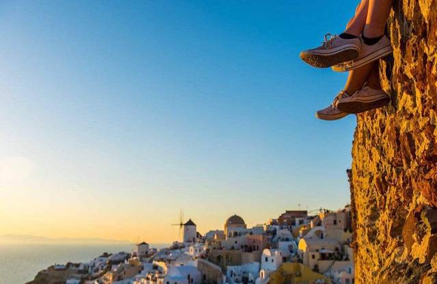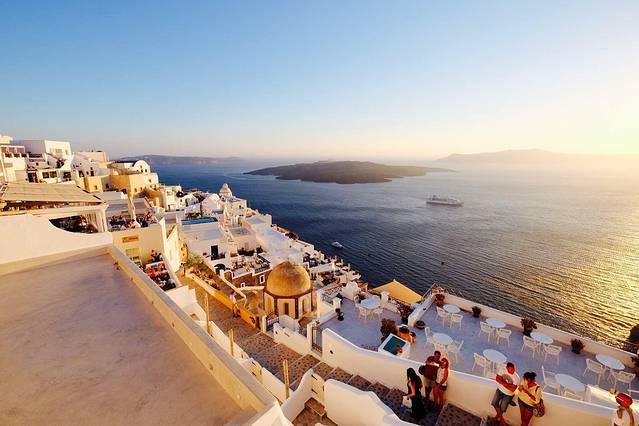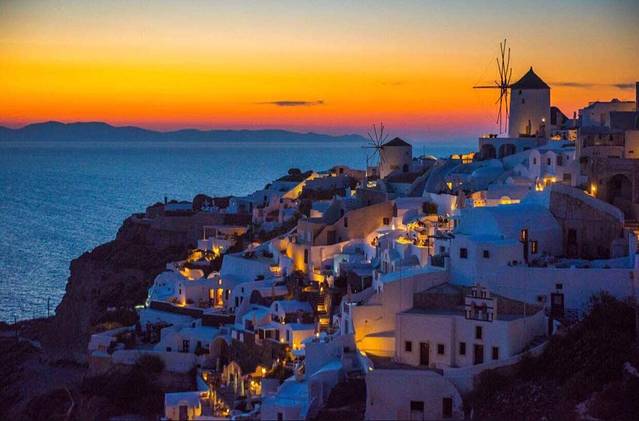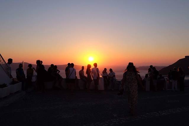 这是一场每天都上映的电影,黄昏时分,来自世界各个角落的人们便会纷至沓来,涌入临海的断崖上,无论是甜蜜蜜的情侣夫妻,还是探访瑰丽风景的游人,站着的,坐着的,甚至舒服地躺着的,大家都静静地等待着一场华丽丽的“日落爱琴海”的盛宴。