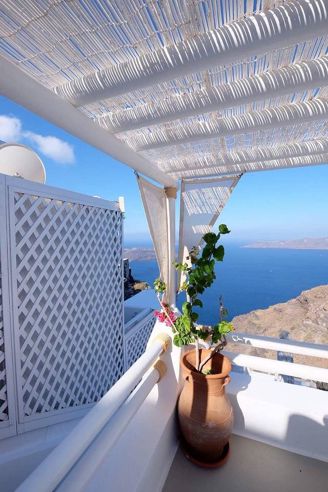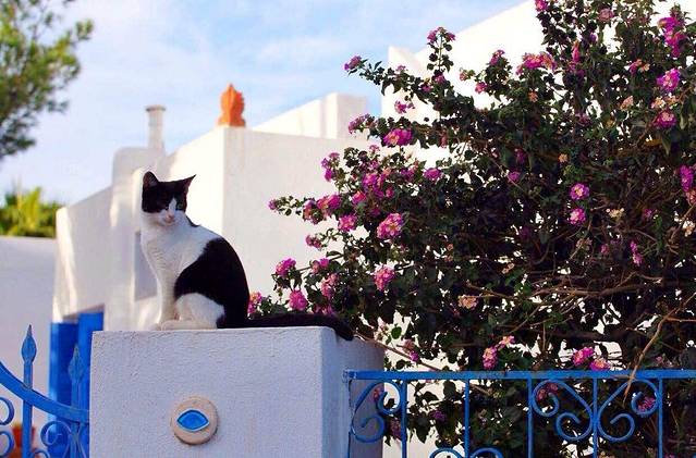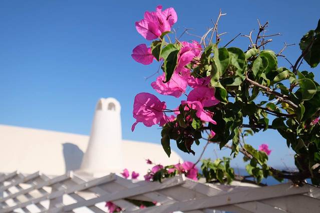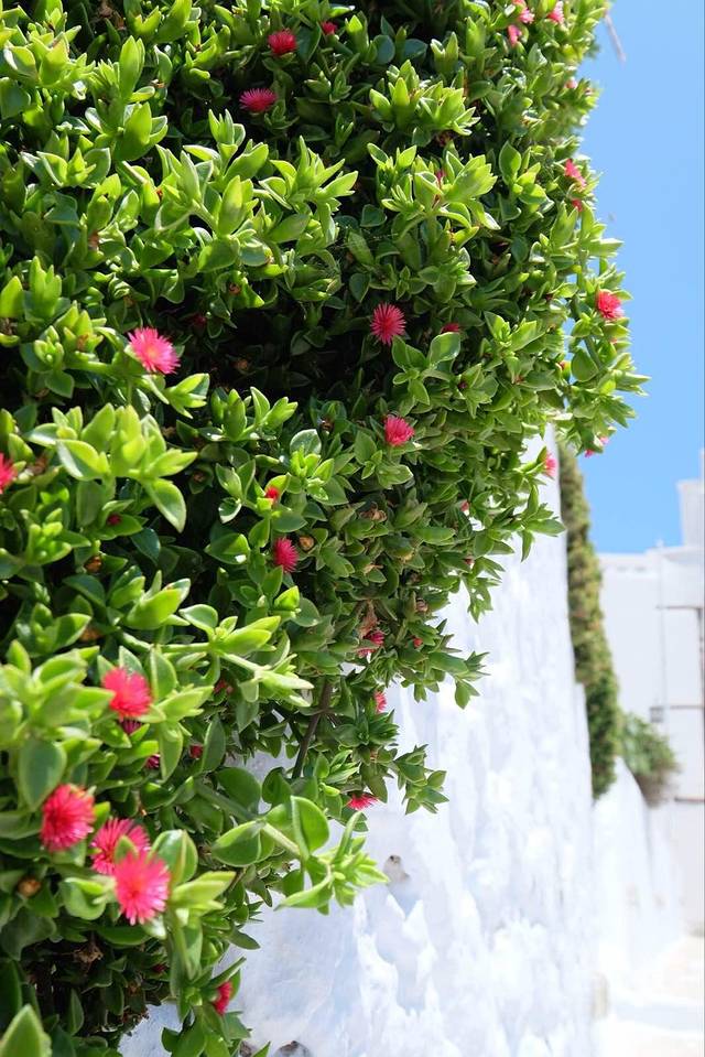 如果说小岛全被蓝白包围,那也似乎单调了点。随便往哪户人家一望,准能看到点缀在阳台、走廊或屋顶上的装饰物:可能是几盆开得艳丽的花朵,可能是几个造型别致的瓦罐,也可能是色彩别致的桌椅,甚至可能就是两块圆溜溜的大石头……