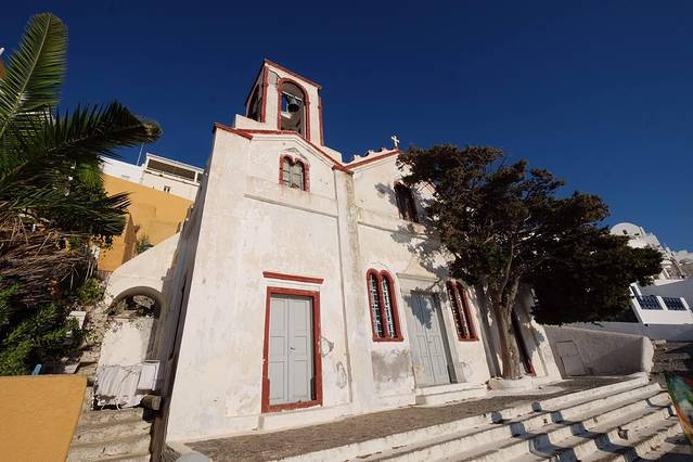 费拉小镇的中心广场称为Plateia Theotokopoulou,有巴士、出租车站、银行和药店。小镇上有无数迷宫般的窄街小巷,曲曲折折、上上下下。走不完的一级级台阶旁,不是咖啡店,就是酒吧间,不是珠宝店,就是礼品屋,你可以在这里买一张明信片,当场投递,寄给家人和朋友分享快乐和祝福。