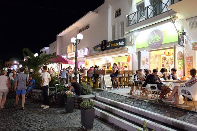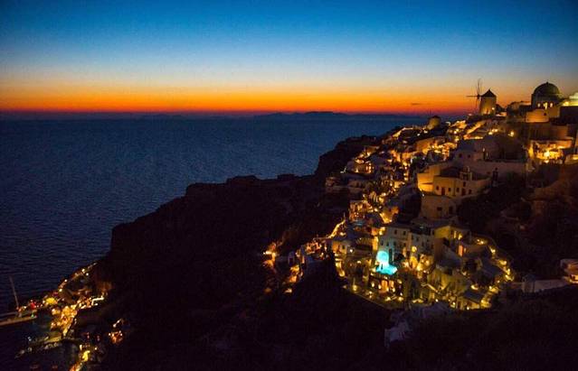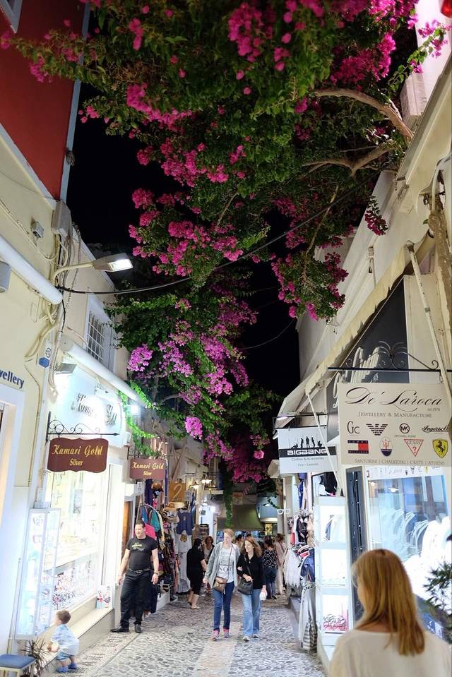 夜晚的伊亚小镇更加风情万种,柔和的灯光从布满各色鲜花的窗框里伸出身来,面对爱琴海的餐桌上,老板精心的摆上了玫瑰和红色的蜡烛,温柔的音乐和满是笑脸的服务生为恋人们摆好了刀叉。美食、美酒、窃窃私语,夜幕下的小镇,陶醉得让你情不自禁。