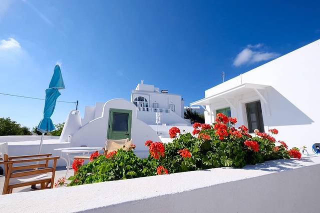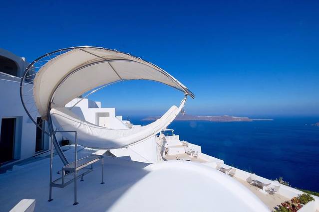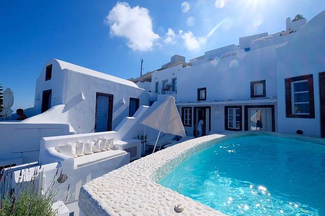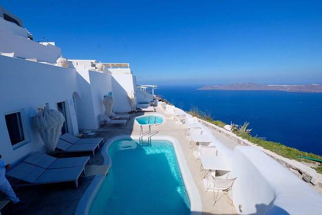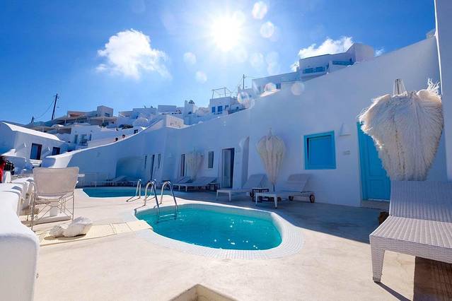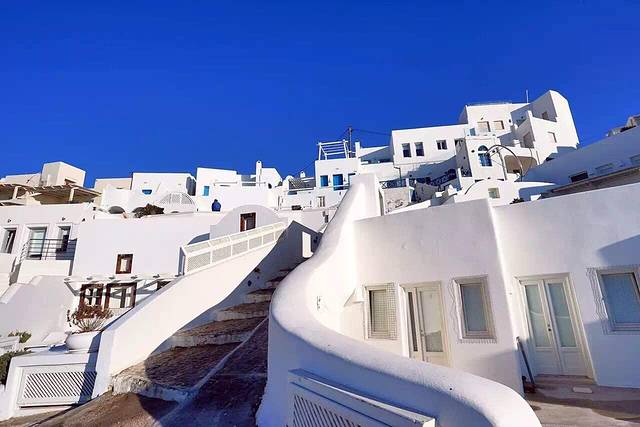 这些白色房屋大多是小型家庭式酒店,但每家都至少有一个蔚蓝的游泳池。人们泡在泳池里俯瞰爱琴海,或者坐在阳台上轻啜着冰啤,甚至可以躺在床上发呆。