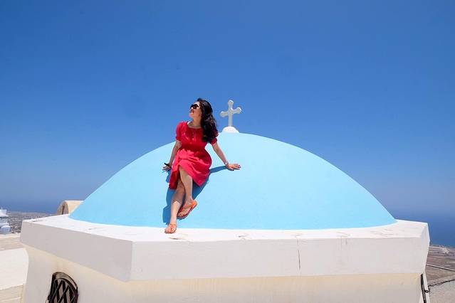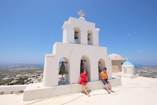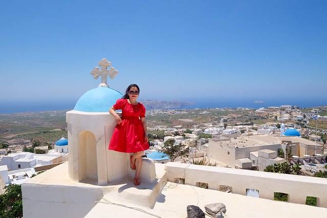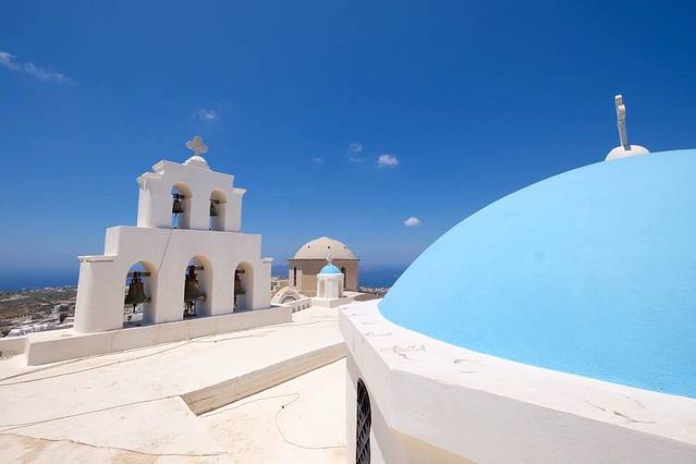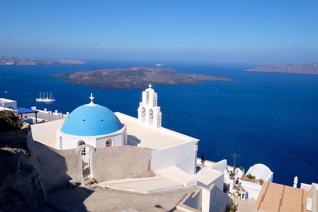 费拉小镇修建在半圆形的圣托里尼岛西部边缘400米高的火山边缘,景色相当壮观,小镇房屋的墙全是白色,屋顶是深蓝色,与天空、海洋混成一体,随手一拍就是一张明信片。