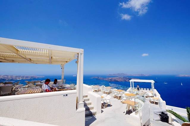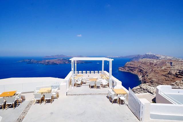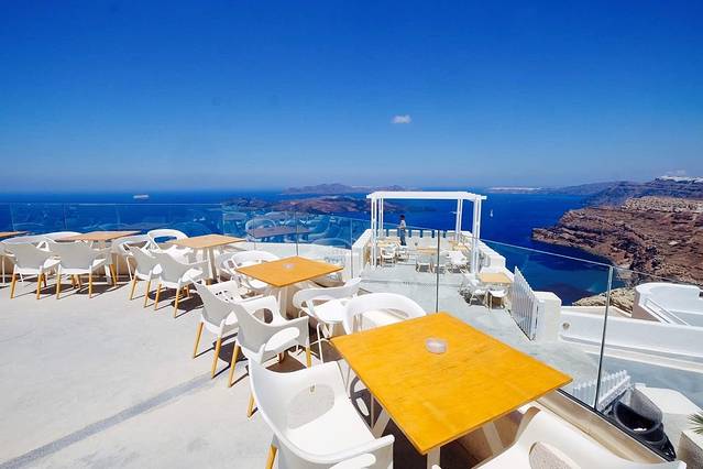 在酒庄,黑黑的悬崖边上延伸出一个观景平台,平台上设置了桌椅,可供远道而来的游客们边欣赏爱琴海美景,边眺望不远处的火山岛,边品尝圣岛最富盛名的甜葡萄酒。站在观景平台可以清晰地看到悬崖上的小镇Fira和Oia,就像是点缀在黑森林蛋糕上的白色巧克力,精巧而美丽。