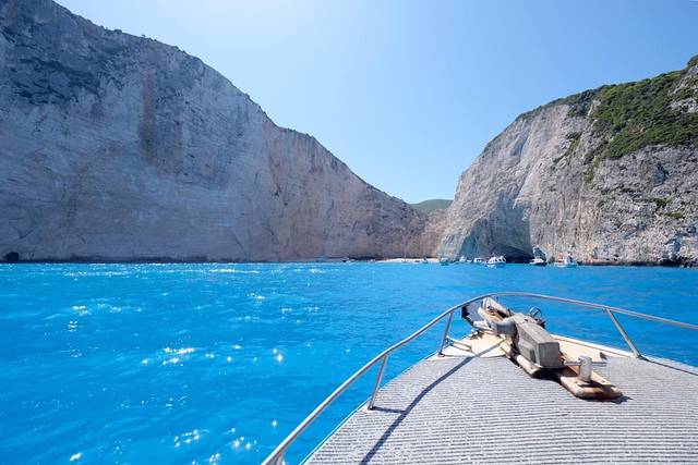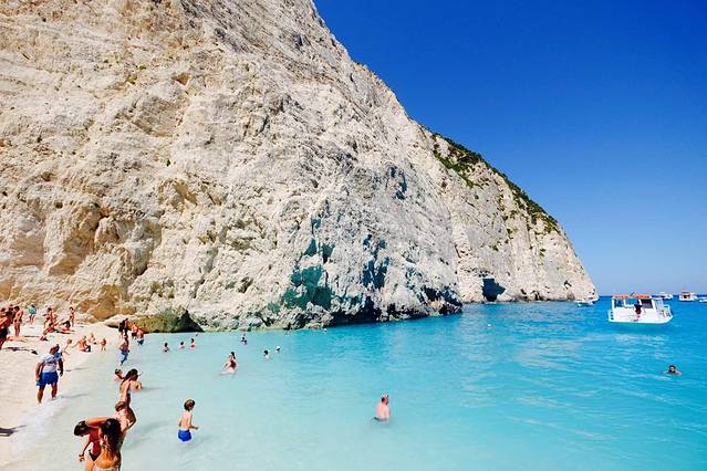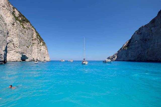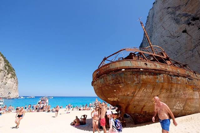 沉船湾(Navagio/Shipwreck),被评为世界十大最美海滩之一,位于扎金索斯岛西北部,辽阔的沙滩上,洁白的细沙反射着太阳的光芒,蔚蓝的海水在阳光的照射下,会深深印在每一个亲眼看过她的人的心中。1983年,一艘往返意大利西西里岛走私香烟的船只Panagiotis号失事搁浅于此而被俗称为“沉船湾”。