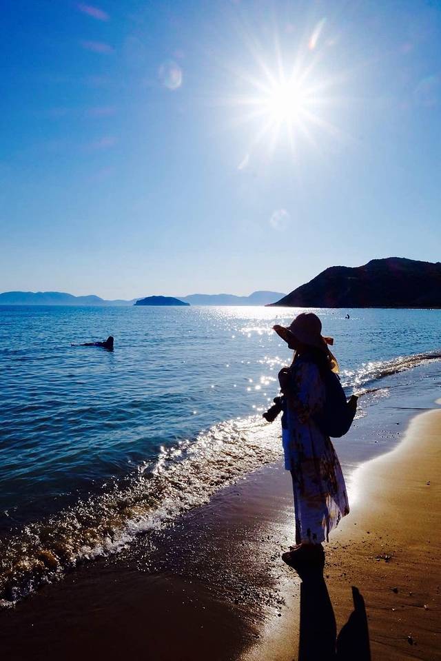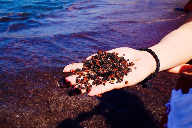 海滩小小的,岸边也不是那种柔软的沙子,而是红褐色的小石子,不过据说这些石头可是真正的火山石。