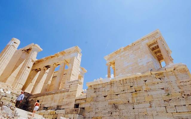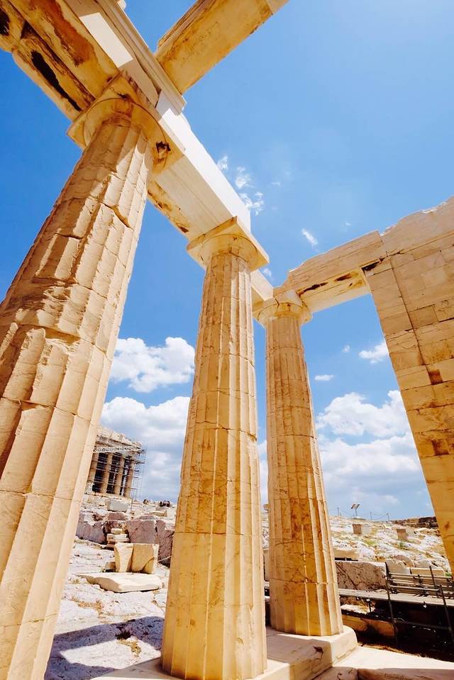 很难描述第一眼看到神庙的复杂心情,昔日的壮观华美,如今只余断壁残垣。帕特农神殿庙顶屋盖无存,内里空空如也,女神像早已无存。乱石嶙峋间惟有那几根大理石柱依然擎天而立,周围还布满了脚手架,依稀可见当年的辉煌,却也尽是往日烟尘了。
