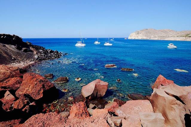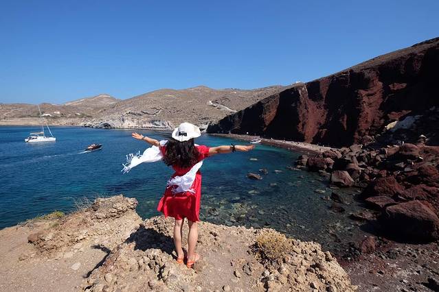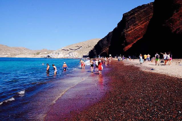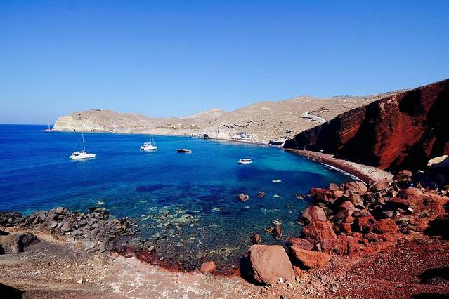 红沙滩在圣托里尼南端的Acrotiri(阿克罗提尼)旁,这是一片景致迷人、与世隔绝的美丽海滩。