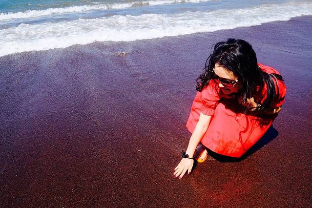 红沙滩来源于深红色的岩石,而深红色的岩石是黑色的火山石里面的磁铁矿经过漫长的岁月氧化而呈现出红色形成的。