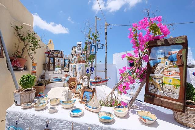 皮尔戈斯的小画廊,艺术家在古老的窗板上作画,在任何一块木板上都可以画出一副美丽的圣岛美景。