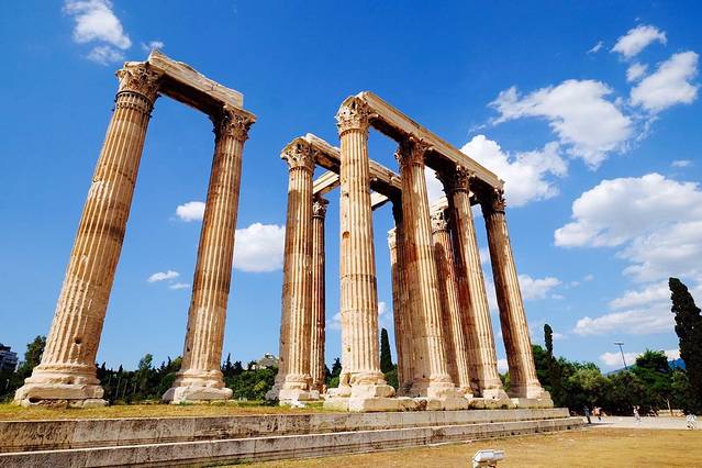 与卫城相距不远的宙斯神庙建于公元前470年,是为祭祀宙斯而建。它是古希腊最重要、最大的神庙之一,也是古希腊文明的重要遗迹。当年的宙斯神庙共有104根石柱,每根高达17.25米,顶端直径1.3米,全部由大理石建成,后遭毁损,至今仅存16根石柱。