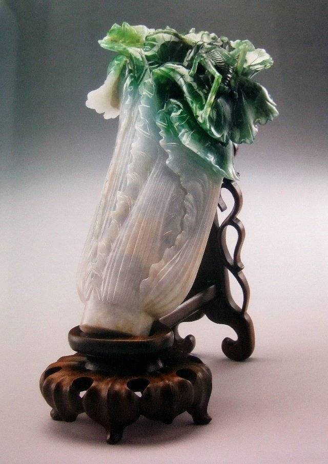 (图片摘自网络)“翠玉白菜”,长18.7厘米,宽9.1厘米,厚5.07厘米。是由一块半白半绿的翠玉为原料,运用玉材自然分布的色泽,雕琢出一颗几可乱真的白菜;翠玉白菜是清代光绪皇帝瑾妃的陪嫁之物,白菜寓意清白,象征新娘的纯洁,菜叶上还雕有螽斯虫和蝗虫,寓意“多子多孙”。