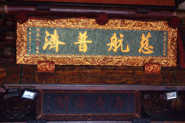 庙中塑像、雕塑皆出自名匠之手。古匾、古联之珍贵丰富更是全台庙宇少见。这是马英九书写的匾额。