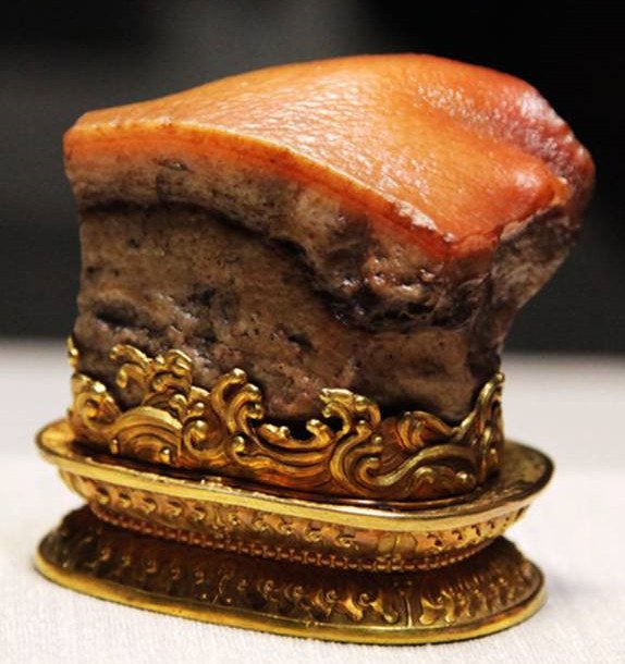 (图片摘自网络)“肉形石”,高5.73公分,宽6.6公分,厚5.3公分。肉形石出自内蒙阿拉善左旗,清康熙时供入内府。这块清代的肉形石,是一块天然的石头,色峰纹理全是天然形成的,取自一块黄玉,经人的鬼斧神工,竟然就雕成了一块玉东坡肉。很像一块美味多汁、肥瘦相间的“东坡肉”。