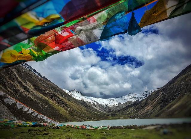 经幡包围的拉姆拉错层层叠叠,峡谷里的大山也层层叠叠,