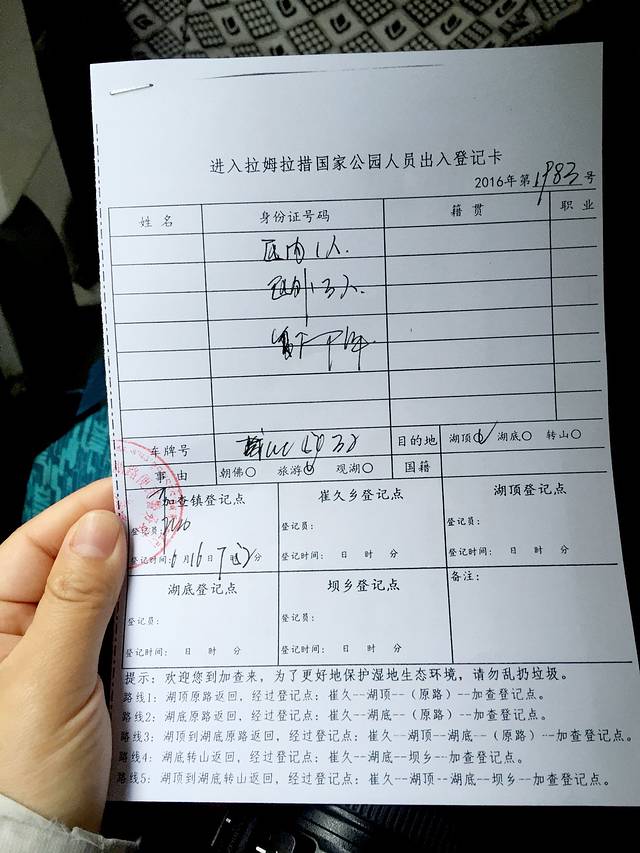 进入拉姆拉错国家公园的出入登记卡,入内时要把身份证全部压去,出来时用这张纸交换回来;